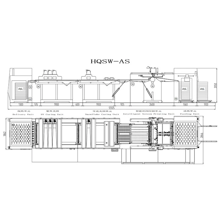 Pažangi UV kietėjimo snaigių kietėjimo šilkografijos mašina HQSW-AS yra specialiai sukurta aukščiausios klasės pakuočių gamybai, kuriai reikalingas snaigės žingsnis. Jis plačiai naudojamas spausdinant aukščiausios kokybės dovanų dėžutes, mooncake dėžutes, tabako / alkoholio pakuotes ir panašius gaminius.
